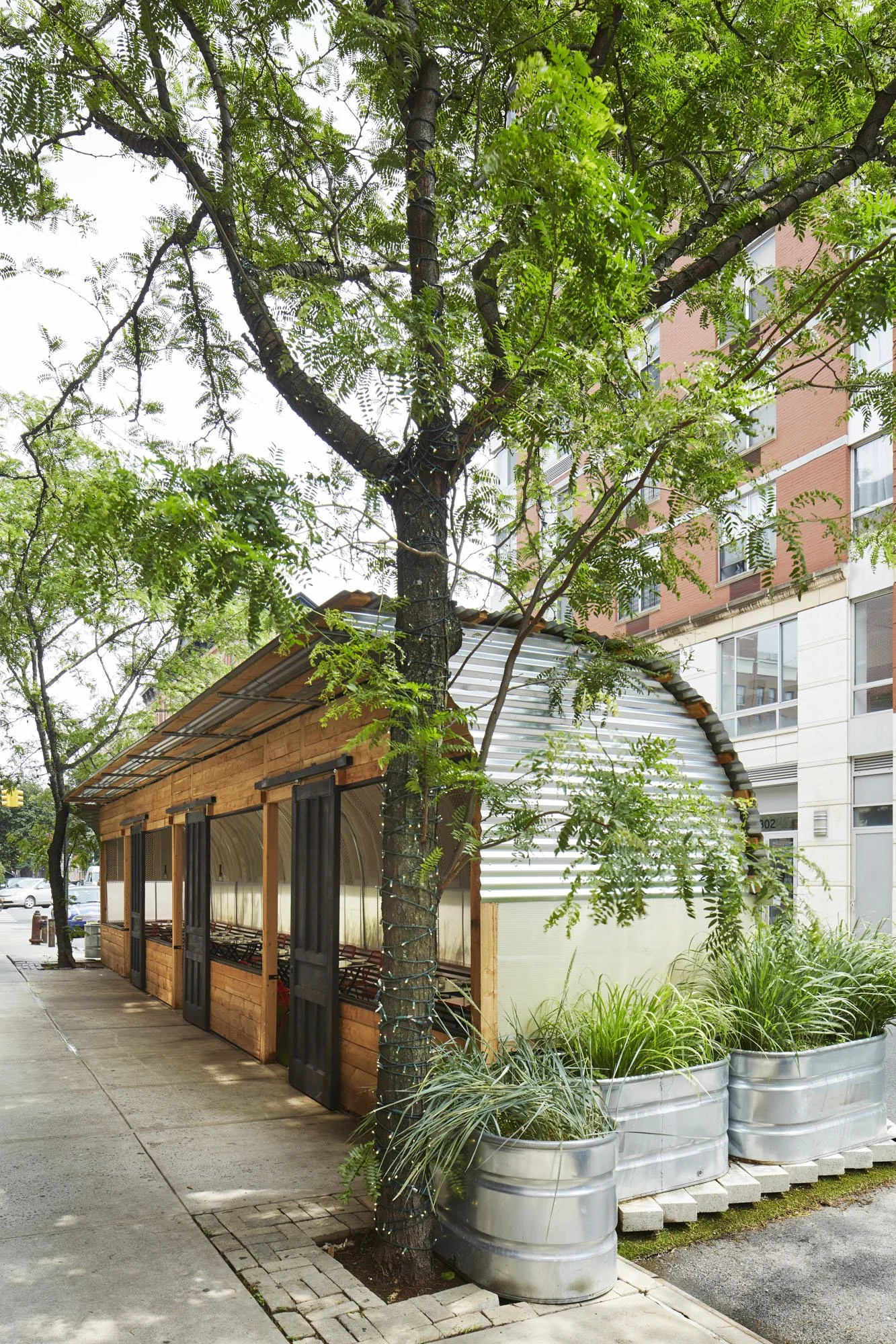 A four-season structure for eating. It can be opened entirely in summer and closed entirely in winter. Built from larch, industrial wool remnant, recycled polycarbonate panels, galvanized steel roofing, and upcycled doors preserved with yakisugi (burnt boards).